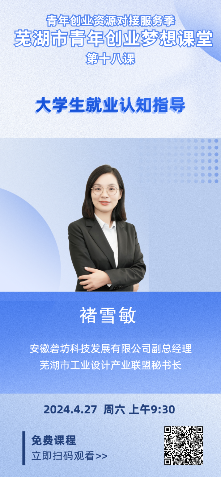 4月27日上午,“源來好創業”青年創業資源對接服務季——蕪湖市青年創業夢想課堂第十八課正式播出。本次是由安徽礱坊科技發展有限公司副總經理,蕪湖市工業設計產業聯盟秘書長褚雪敏帶來的《大學生就業認知指導》課程。